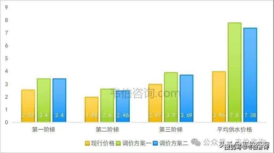 两方案的平均供水价格都是3.4元/立方米(含税),但居民和非居民对供水价格上涨的分担程度有所不同。方案一侧重于节省非居民端用水开支,方案二节省居民端用水开支。