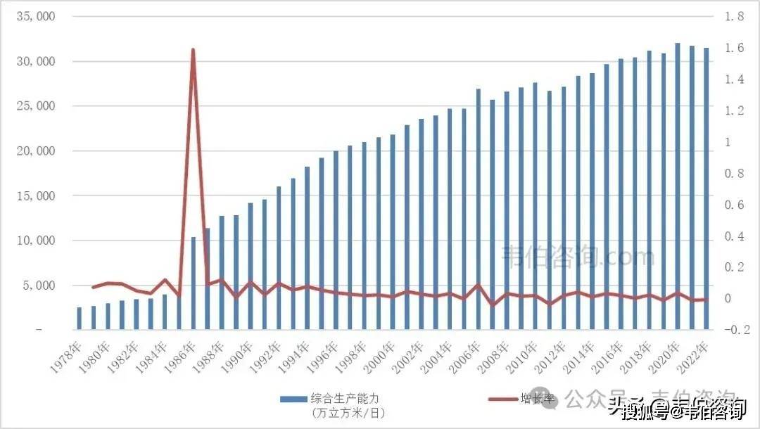 图表3:1978-2022年中国城市供水综合生产能力及增长趋势(万立方米/日,%)