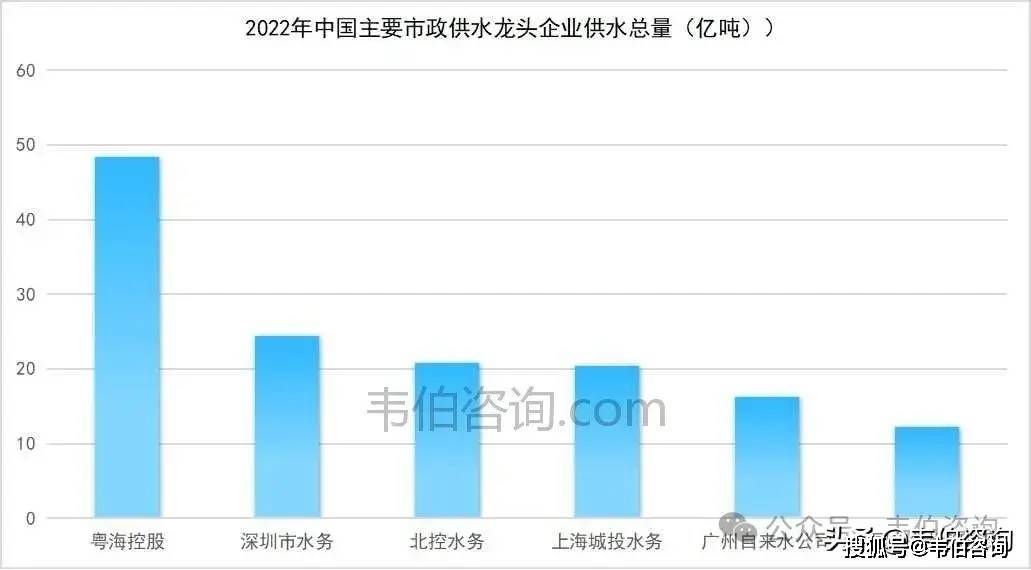 以供水量计算,韦伯咨询根据各公司发布的公开数据整理,粤海控股以48.42亿吨的供水量排名第一,并大幅领先其他龙头企业,其城市供水业务主要由粤海水务股份及粤海水务控股负责运营,业务范围包括江苏、广西、广东、海南、江西和安徽的部分区域,控股的自来水子公司数量超过50家。