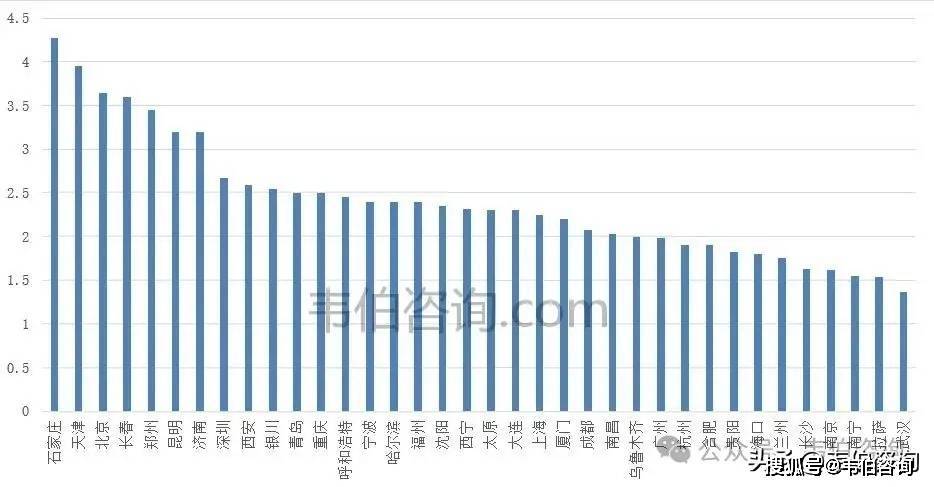 截止2024年3月,从全国36个重点城市自来水价格排名来看,石家庄、天津、北京、长春、郑州等水资源匮乏的北方城市自来水价格明显高于其他城市,分别为4.28、3.95、3.64、3.6、3.45元/立方米;南宁、、武汉三个城市的自来水价格最低,分别为1.55、1.54、1.37元/立方米。