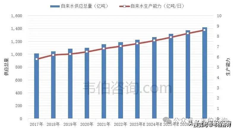 2022年,中国的自来水综合生产能力约为7.亿吨/日,供水总量约为1188亿吨。随着城镇化的进一步发展及农村供水设施的完善,预计到2027年中国自来水供应能力及供应量将分别达到8.6亿吨/日及1421亿吨的规模。