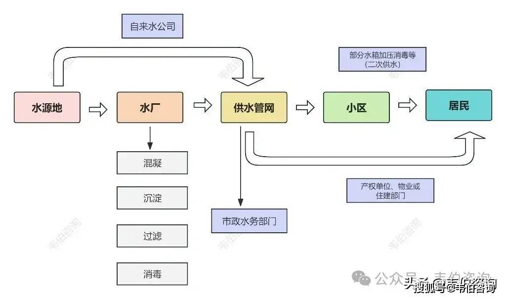 目前,城市供水的流程大致如下:水从水源地输送至水厂——经混凝、沉淀、过滤、消毒等工序处理——通过主支管网输送到千家万户。对于一些小区的高层建筑,通常还需要采取水箱加压、消毒等措施进行二次供水。