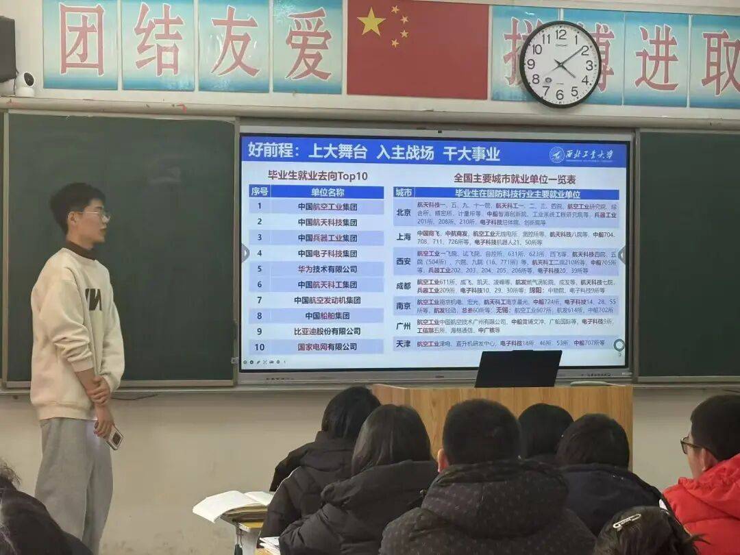 2月1日,“鲁西宝塔小分队”回访母校,走进高三60班开展招生宣讲。小队成员先分发精心整理的资料,再以PPT为主线,详细介绍西工大整体概况、学科特色、招生政策等核心内容,解读了“西工大是什么样的学校、适合什么样的学生、未来能走向哪里”。在交流环节,小队成员耐心回应同学们的踊跃提问,助力学弟学妹系统认识西工大、明确备考方向。