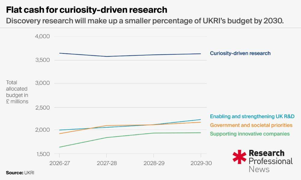 到2030年,UKRI给“好奇心驱动型”研究的预算几乎维持不变(其中粒子物理、核物理和天文学等领域资助削减,其他领域还在增长,此消彼长),而其他渠道的预算都在增长 来源:UKRI