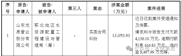 2月12日,上市公司龙泉股份(全称山东龙泉管业股份有限公司)发布关于累计诉讼、仲裁情况的公告,披露了两起涉案金额超千万的案件情况,其中就包括涉案金额高达1.3亿元的诉鄂北地区水资源配置工程建设与管理局(筹)案,如下表所示:
