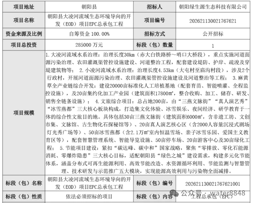 日前,辽宁朝阳县大凌河流域生态环境导向的开发(EOD)项目EPC总承包工程中标候选人公示。