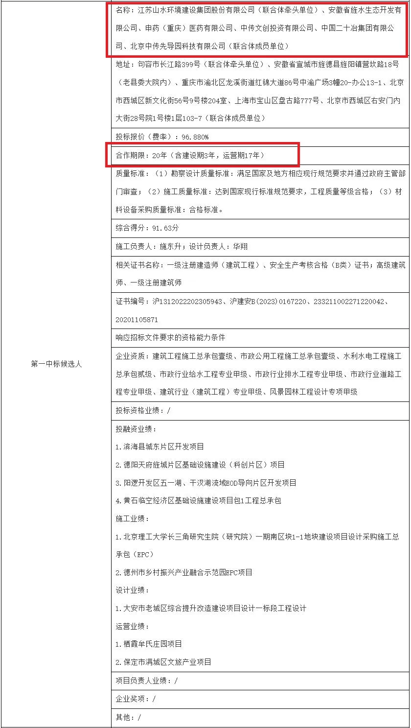 第一中标候选人:江苏山水环境建设集团股份有限公司(联合体牵头单位)、安徽省旌水生态开发有限公司、申药(重庆)医药有限公司、中传文创投资有限公司、中国二十治集团有限公司、北京中传先导园科技有限公司(联合体成员单位),投标报价(费率):96.880%