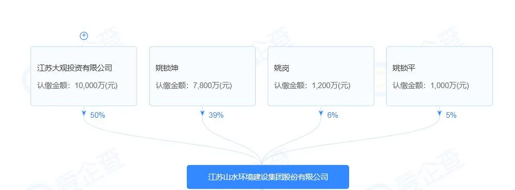 公开资料显示,江苏山水环境建设集团股份有限公司成立于2001年,注册资本2亿元,主营业务涉及对外承包工程、园林绿化工程、公路工程、市政公用工程、古典建筑工程、房屋建筑工程、水利水电工程等等,大股东是江苏大观投资有限公司,持股50%,为民营科技企业。