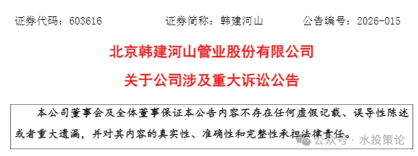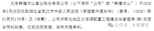 3月3日,上市公司韩建河山(全称北京韩建河山管业股份有限公司)发布关于公司涉及重大诉讼公告,披露了涉案金额超1.9亿元的诉鄂北地区水资源配置工程建设与管理局(筹)案: