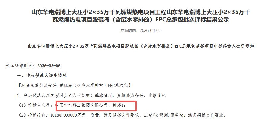 3月3日,山东华电淄博上大压小2×35万千瓦燃煤热电项目脱硫岛(含废水零排放)EPC总承包中标候选人公示。